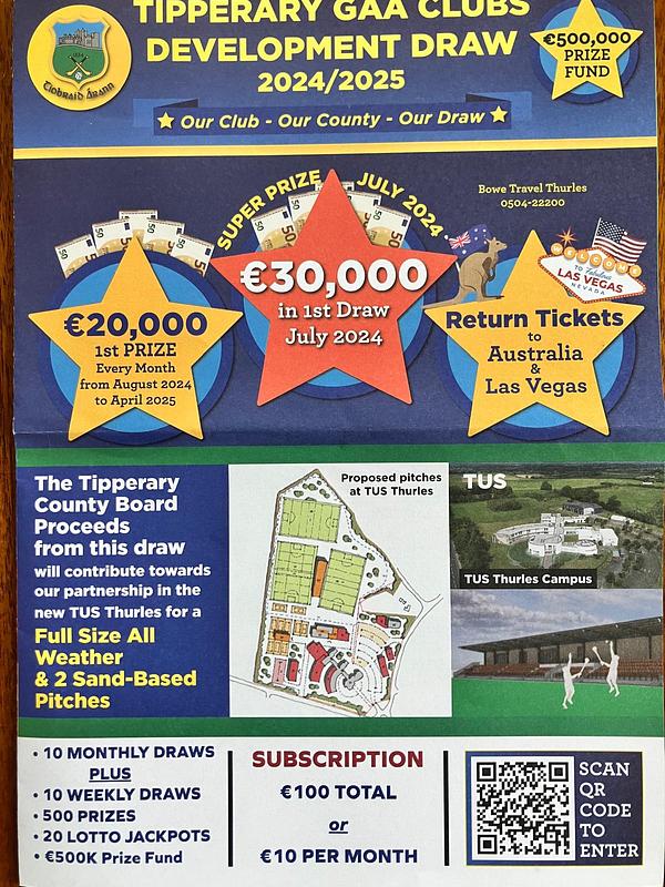 There is a separate local club promotion draw for €200 for any draw participants that sign up by D/D or who pay full €100 upfront before the 19th July. The club relies hugely on the draw income to fund operations every year so really appreciate your help. Please give any member of the committee a call if any queries.